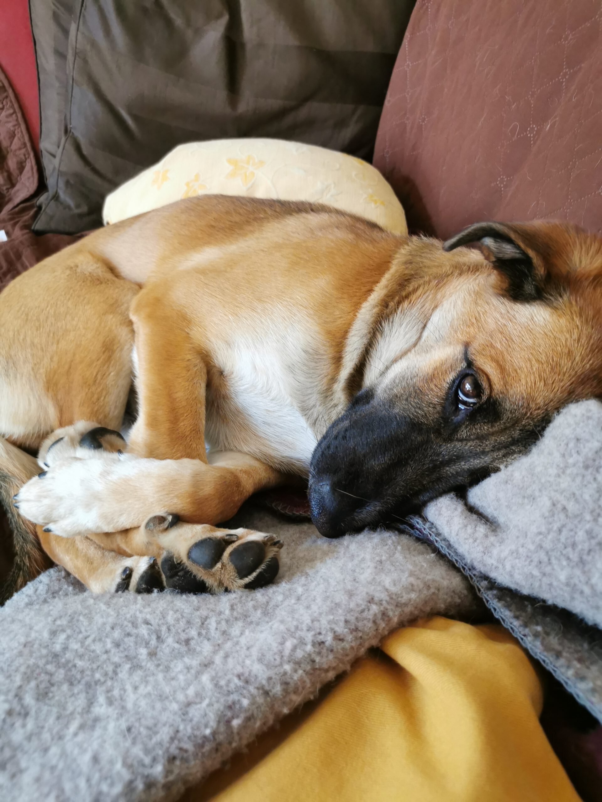Inzwischen hat er eine Menge gelernt. In Haus und Garten fühlt er sich sicher und sehr wohl. Er ist stubenrein, läuft Treppen, hat kein Problem mit Geräuschen wie Fernseher und Staubsauger. Mir gegenüber ist er sehr verschmust und ich kann ihn überall anfassen. Mit Spielzeug kann er sich selbst gut beschäftigen. Im Auto fährt er kurze Strecken gut mit und steigt auch schon alleine ein.