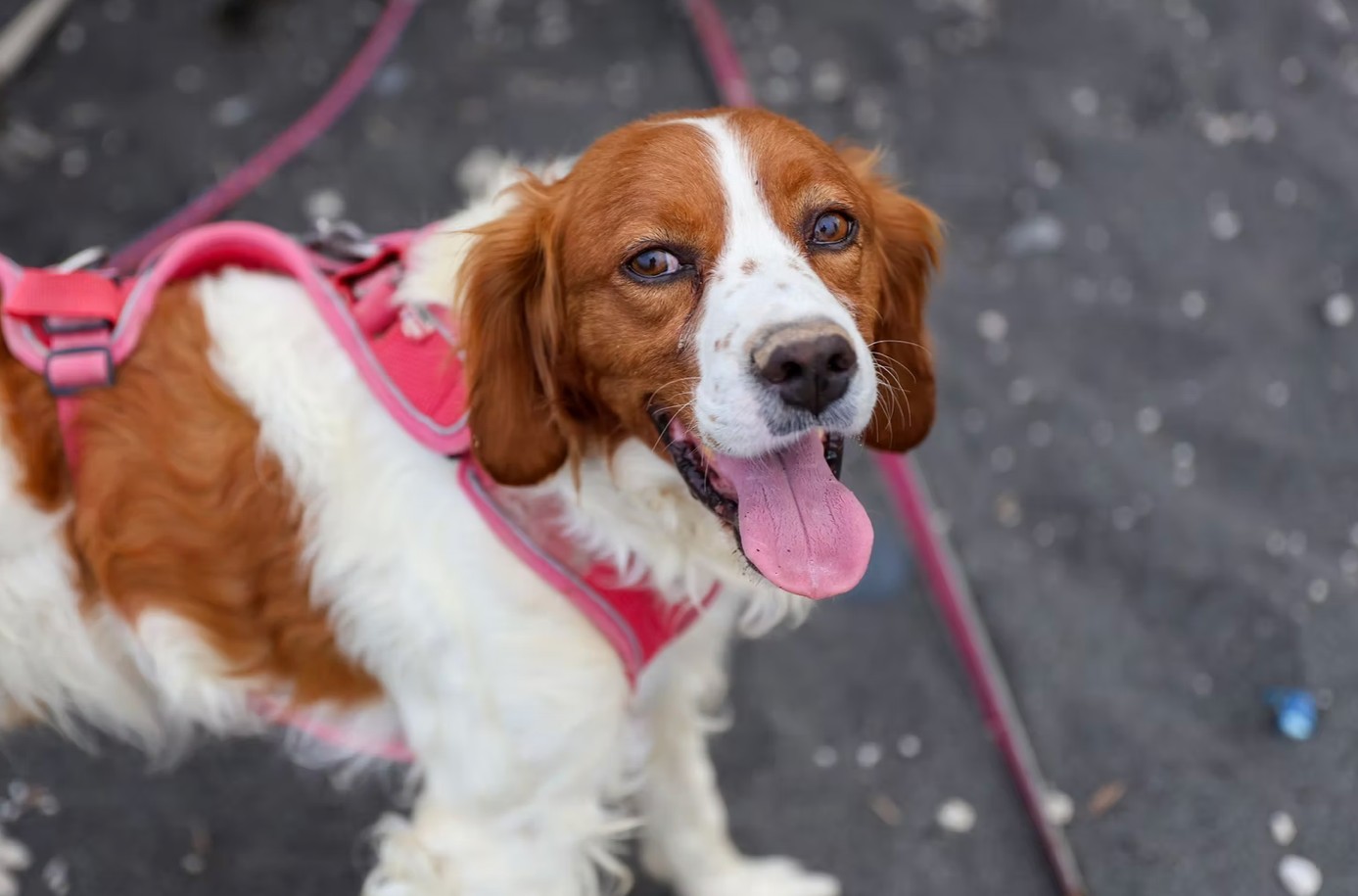 Er trägt sehr gerne sein Geschirr und ist zur Stelle, wenn ein anderer Hund in seiner Nähe das gerade beigebracht bekommt, um zu zeigen, wie gut er das kann.