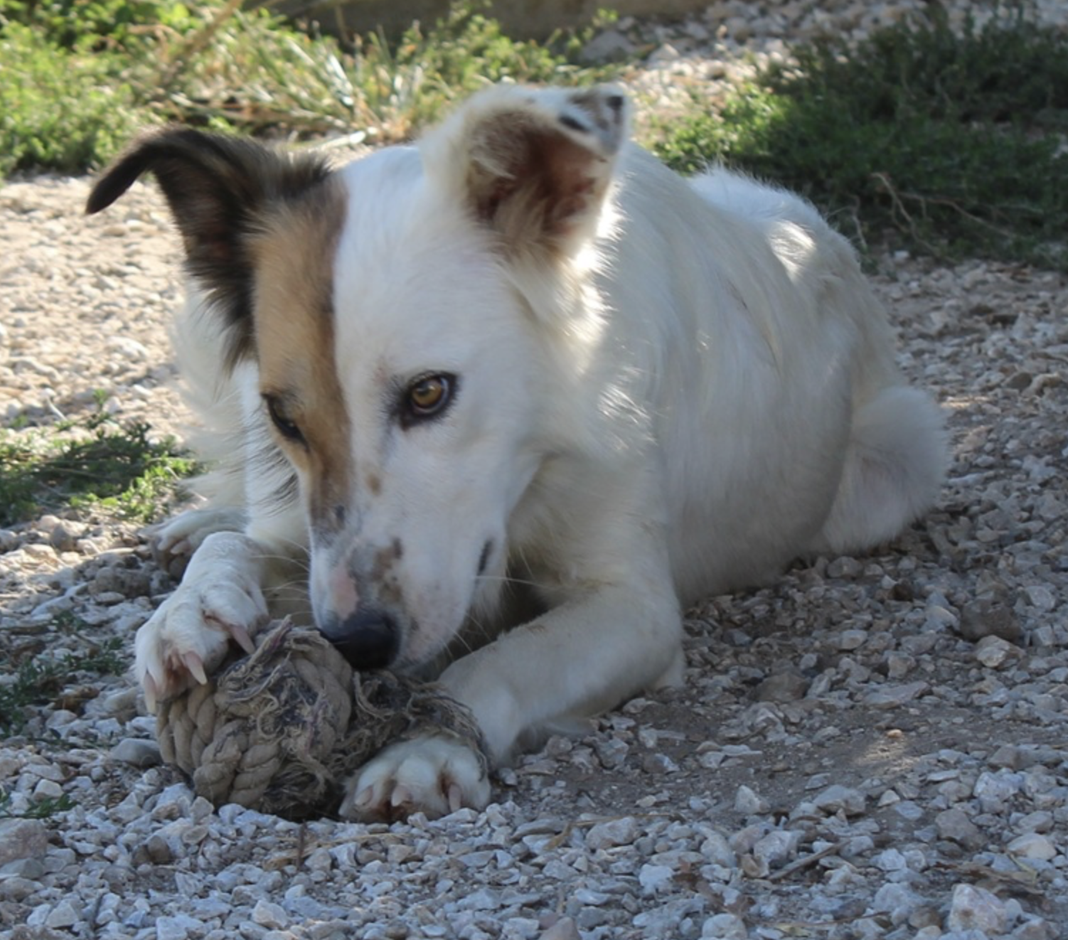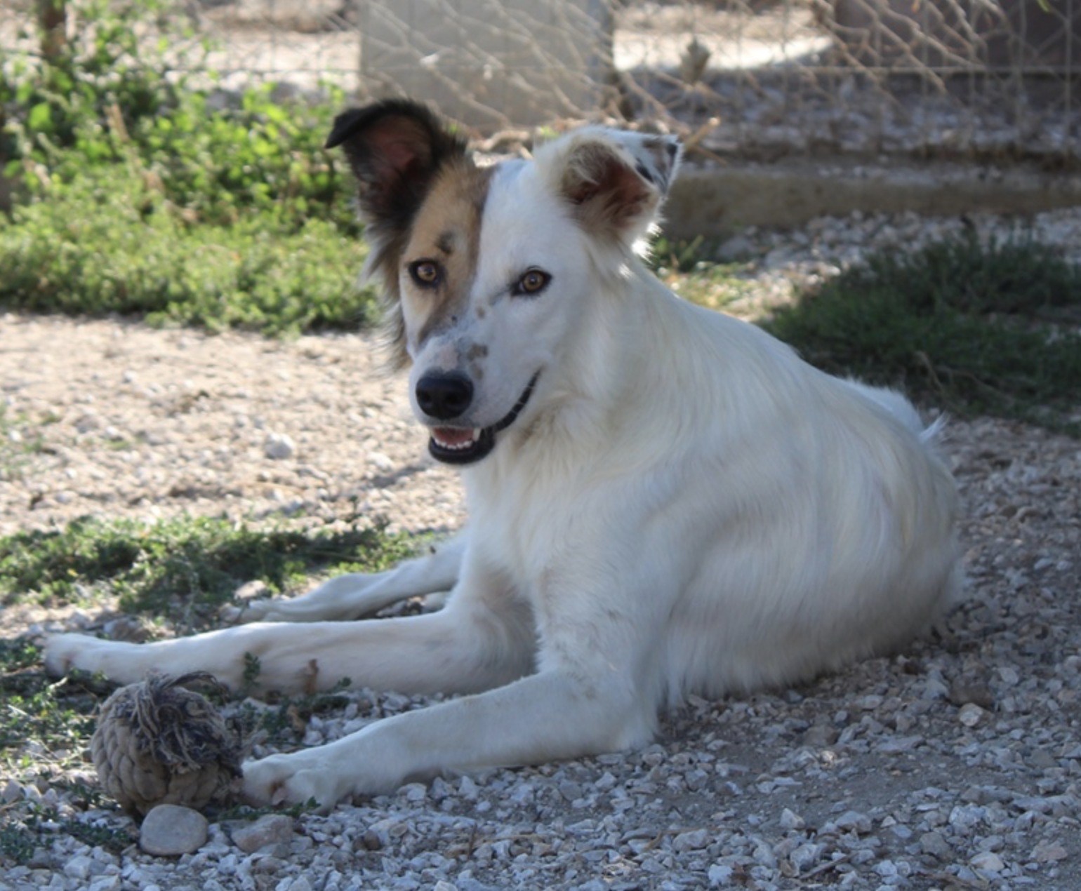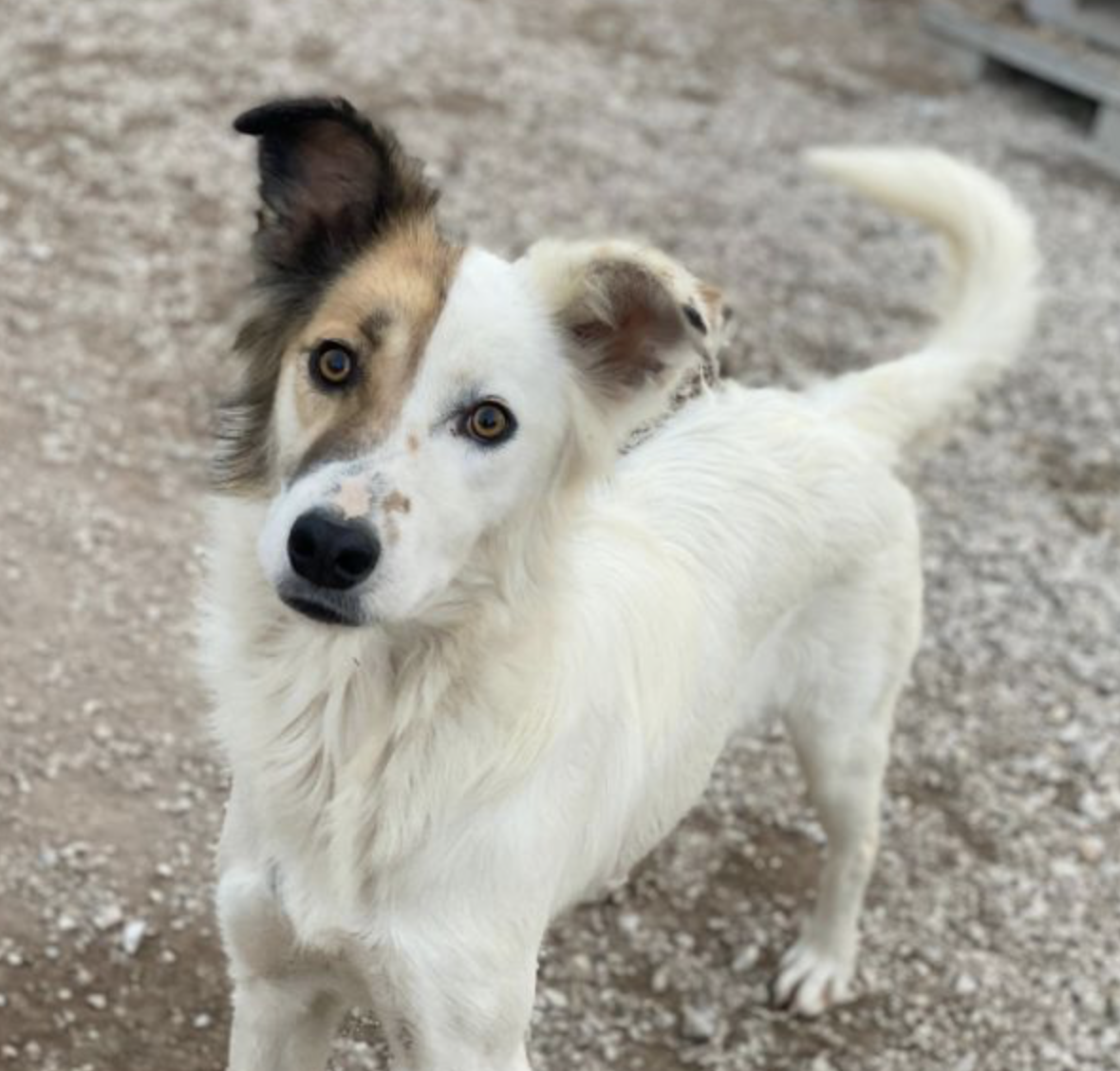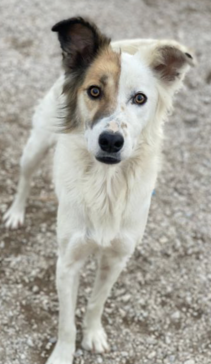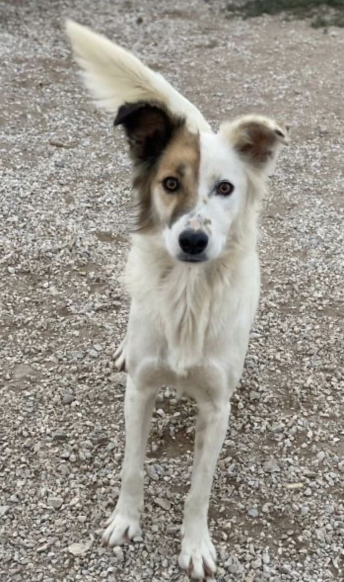 Motti ist eine entzückende Hundedame und hat ein wunderschönes, weißes und flauschiges Fell. Ihre rechte Gesichtshälfte und ihr Ohr sind in einem sanften Braunton gehalten, was sie zu einem absoluten Blickfang macht. Aber das ist noch nicht alles – Motti hat auch lustige Knicköhrchen, die ihr einen ganz besonderen Charme verleihen.